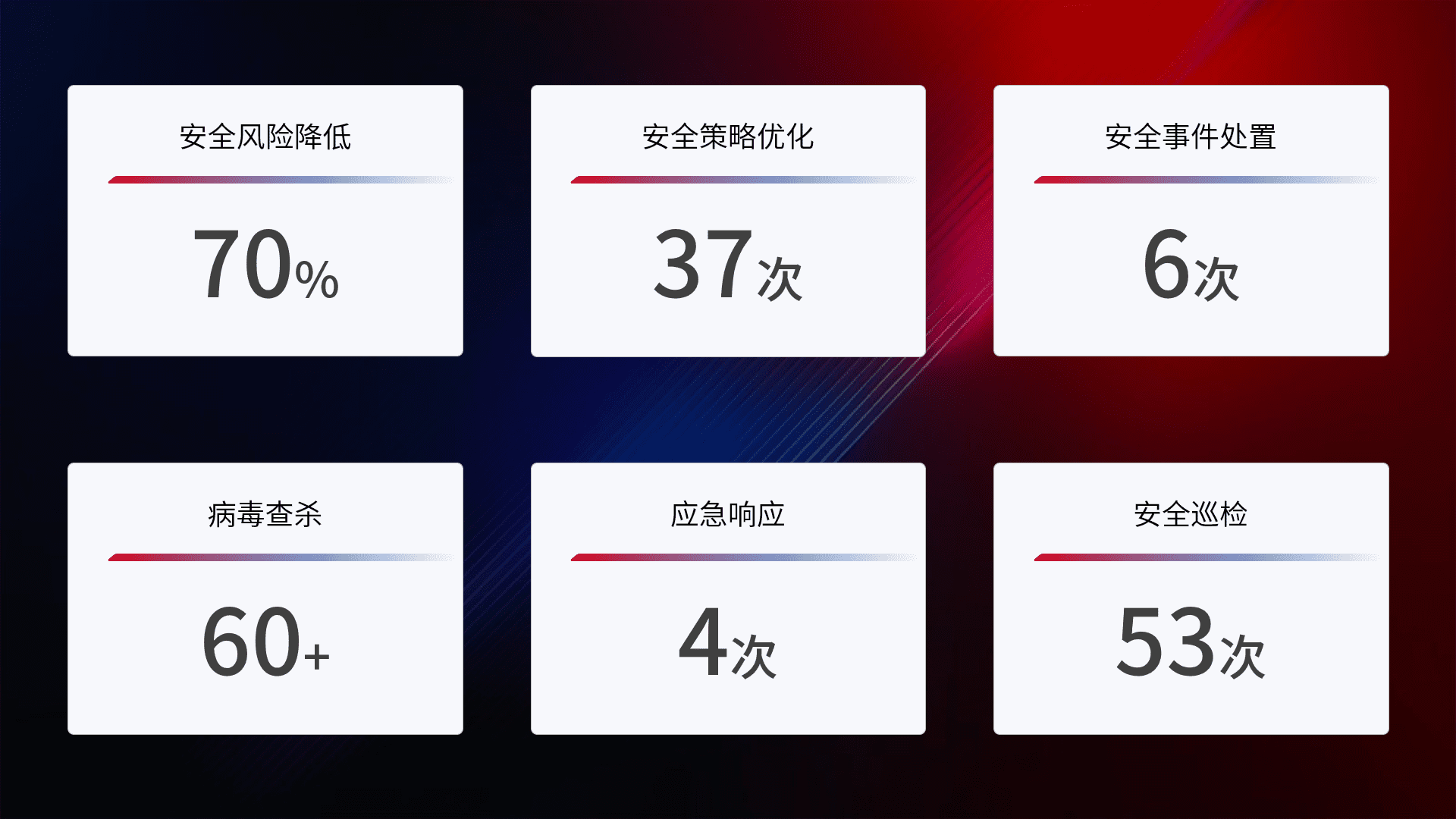 提供全面的安全事件报告体系,,包括处置报告、、、、周报、、季度和年度总结,,,,结合持续监控,,,帮助客户深入了解网络安全状况。。。