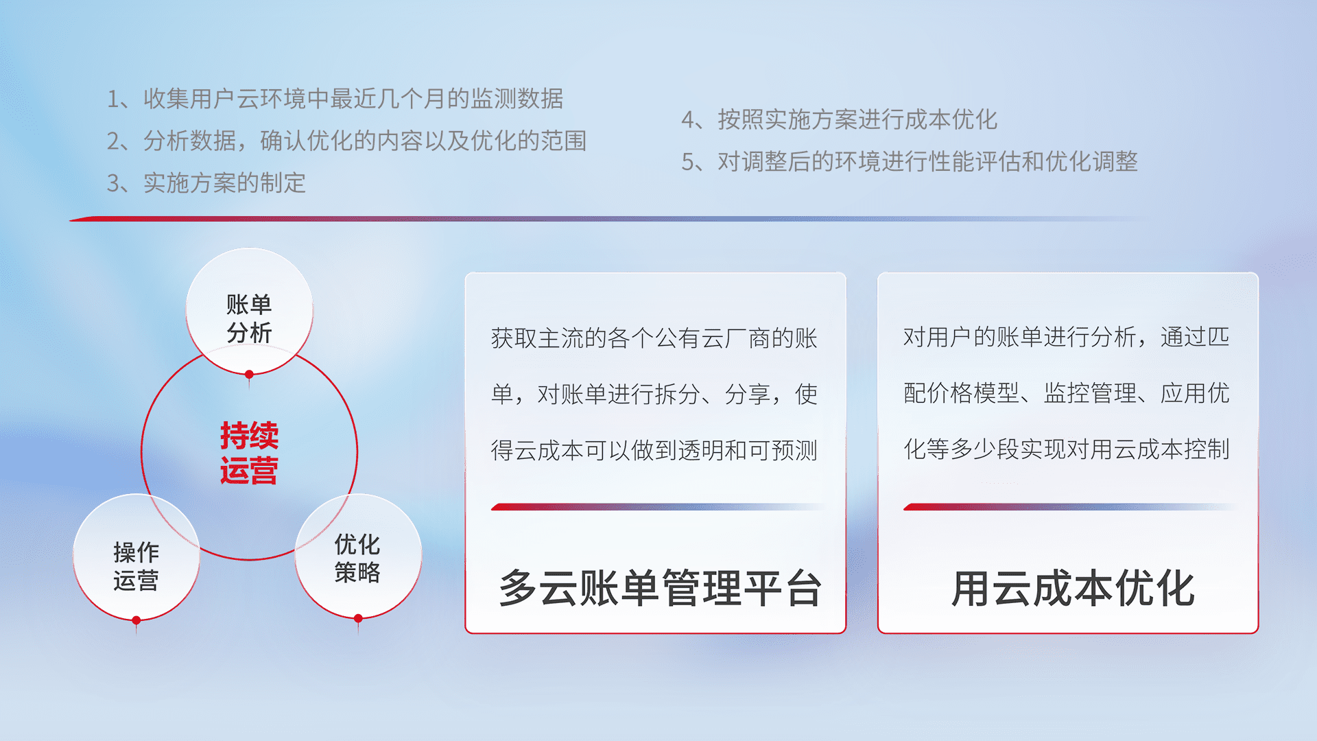 通过多云纳管,,,以统一的资源数据模型把客户的云资源进行抽象和封装,,,进而实现对多云资源的统一操作,,,保障云资源管理的可靠性、、、、稳定性与可用性。。。。量身定制化运维内容,,配置、、开发运维、、、、补丁管理、、、备份、、、、监控、、认证和访问管理、、审计和日常巡检等,,,保障在用云过程中的可靠度,,稳定度以及高可用率。。。