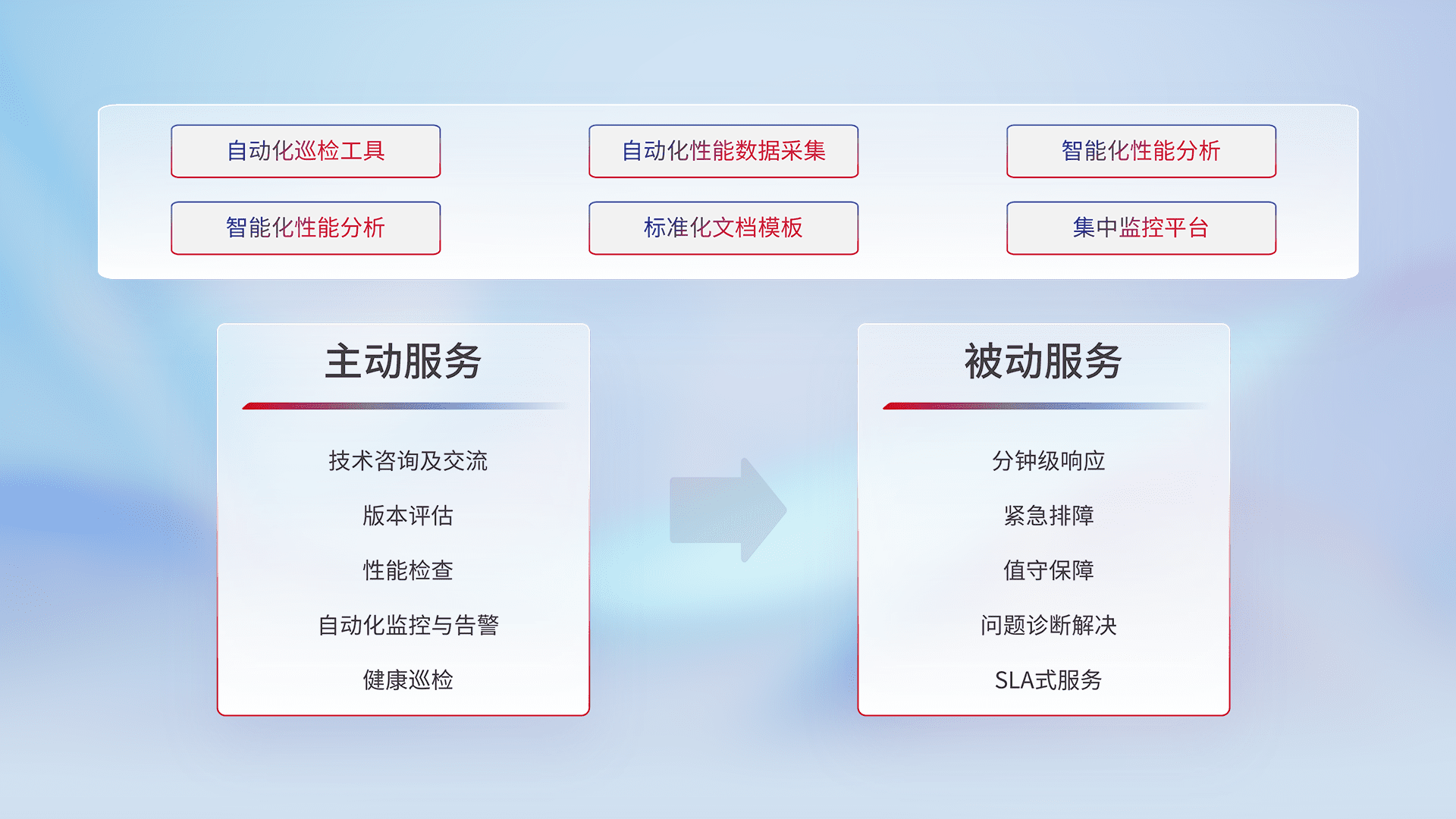智能化工具和标准化文档,,保障服务质量,,,提供主动服务(包含技术咨询、、、版本评估、、、、性能检查、、、、自动化监控与告警、、、健康巡检)和被动服务包含(分钟级响应、、紧急排障、、、值守保障、、、、问题诊断解决、、SLA服务)。。