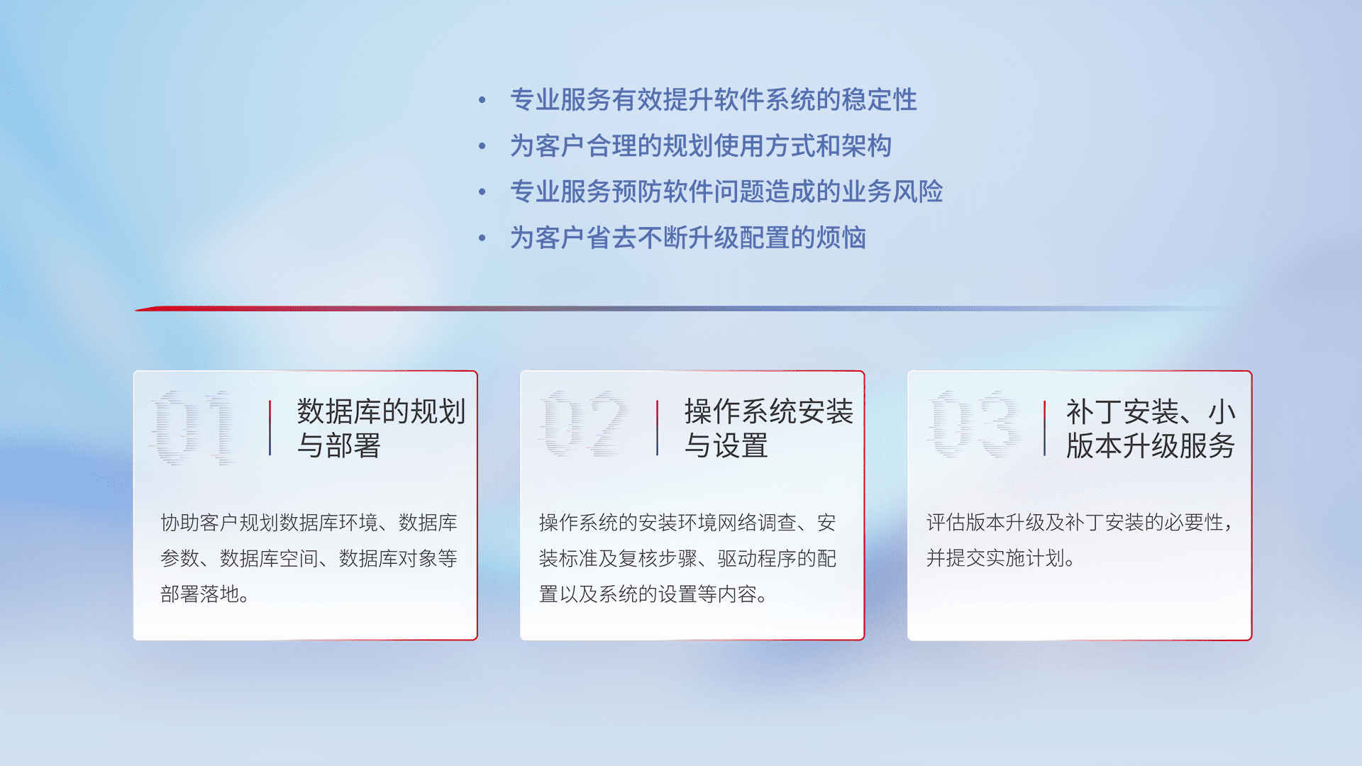 为客户提供软件规模升级、、快速部署、、、、按需配置的专业服务,,从数据库的规划与部署到操作系统的安装与设置,,,再到补丁安装和小版本升级提供支持。。