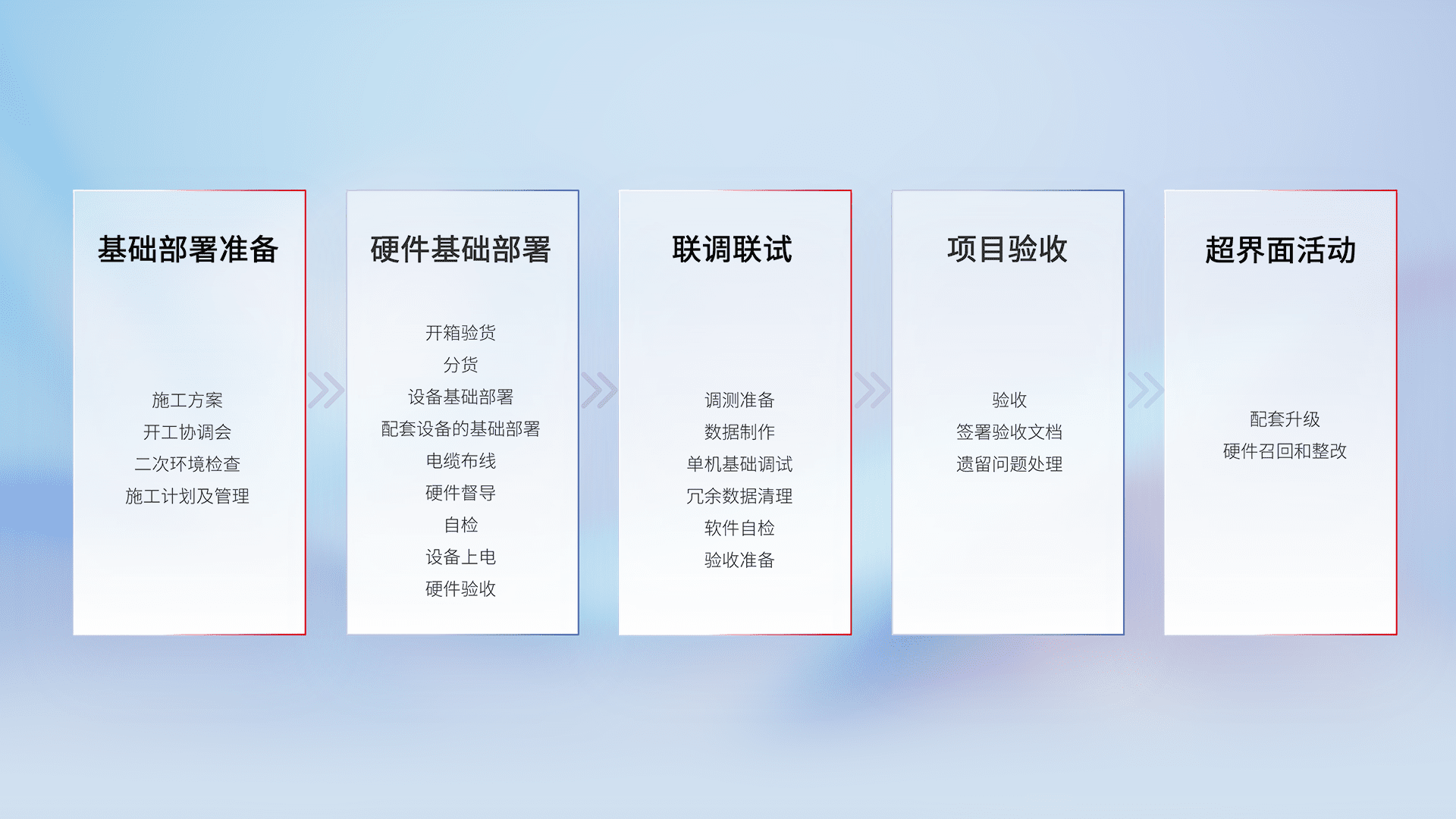 从基础部署准备、、、、硬件基础部署、、、、联调联试、、、、项目验收、、越界面活动的全过程可追溯,,,,保证施工质量和进度。。